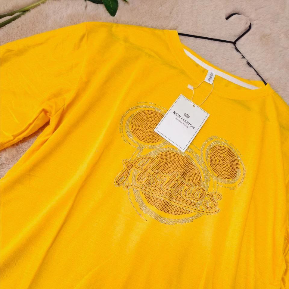 تیشرت نگینی زنانه خارجی نخ پنبه زرد فریسایز